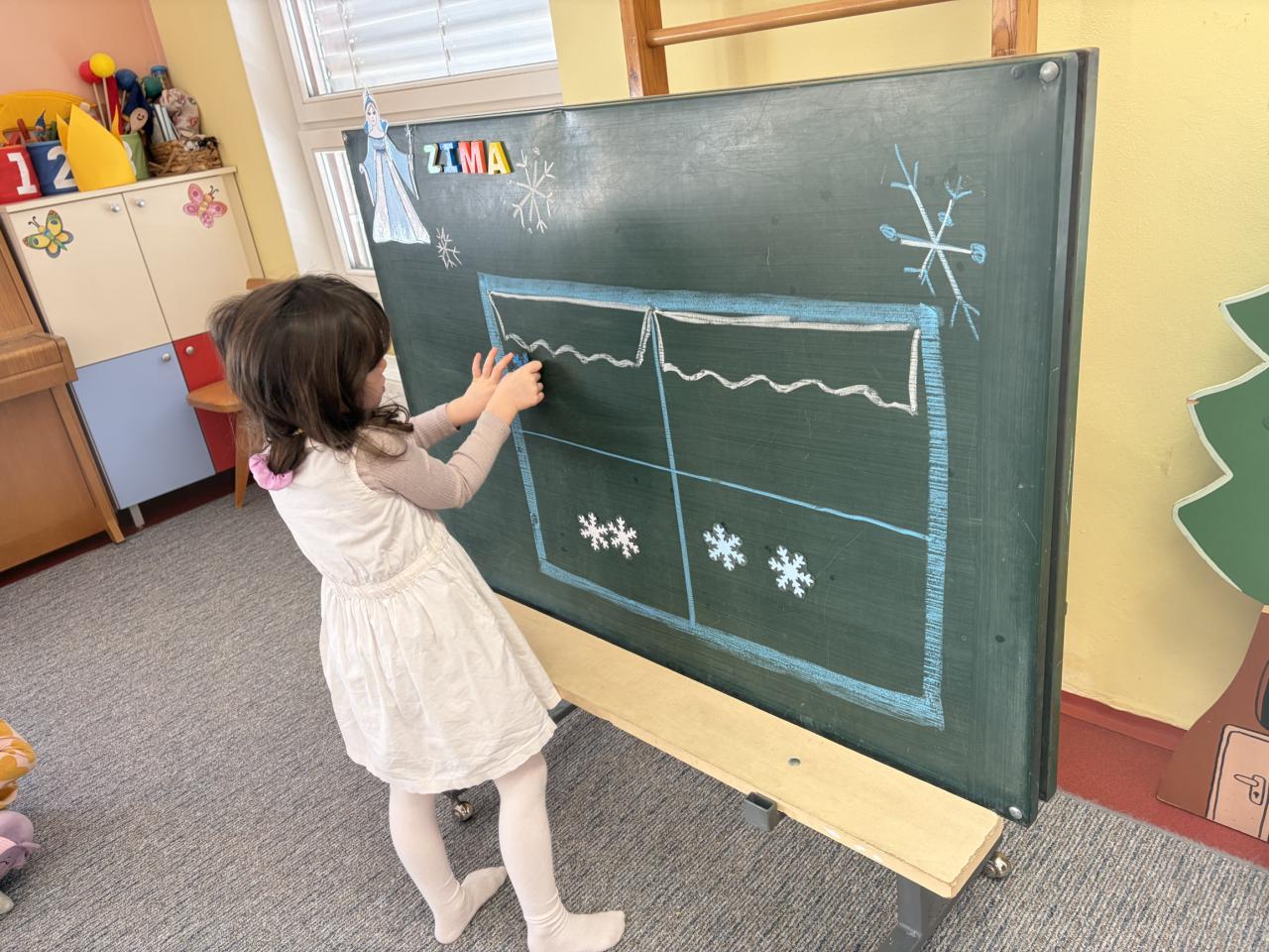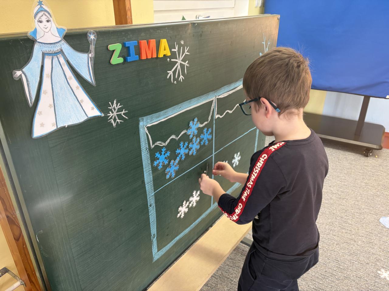 Od pondělí se nám ve třídě sypaly sněhové vločky. Společně jsme je třídili do zamrzlého okna, upevňovali jsme a procvičovali početní představy. Popisovali jsme znaky zimy pomocí ilustračních obrázků. Na zahradě jsme si užili sněhovou nadílku a postavili jsme prvního letošního sněhuláka.