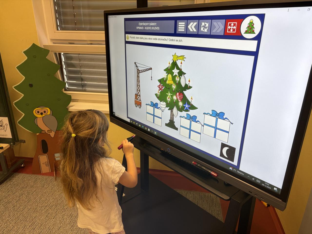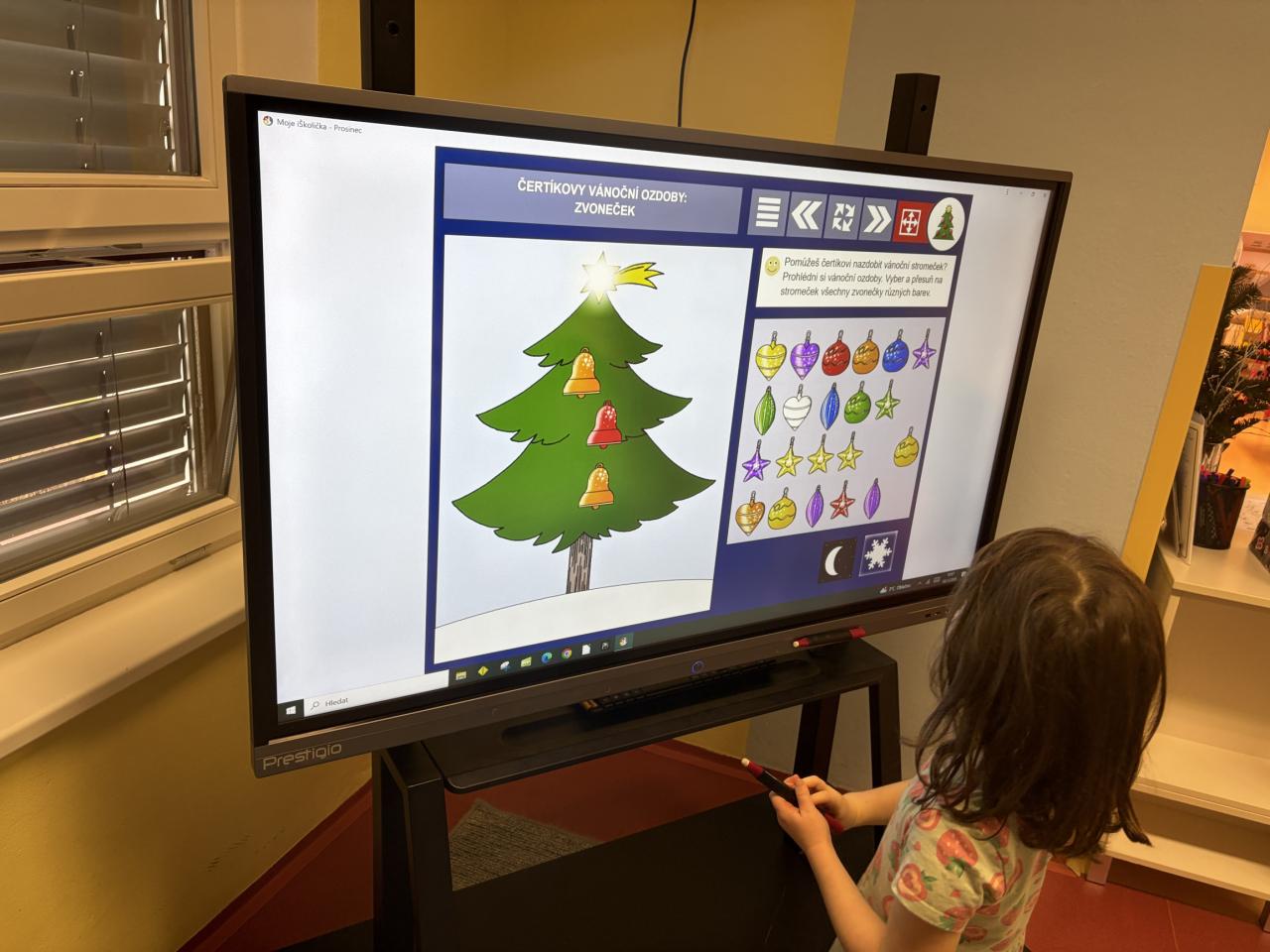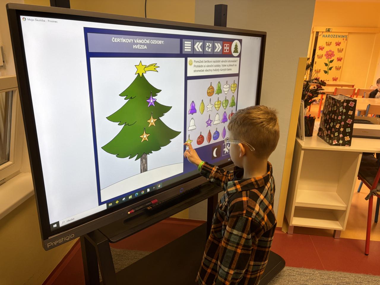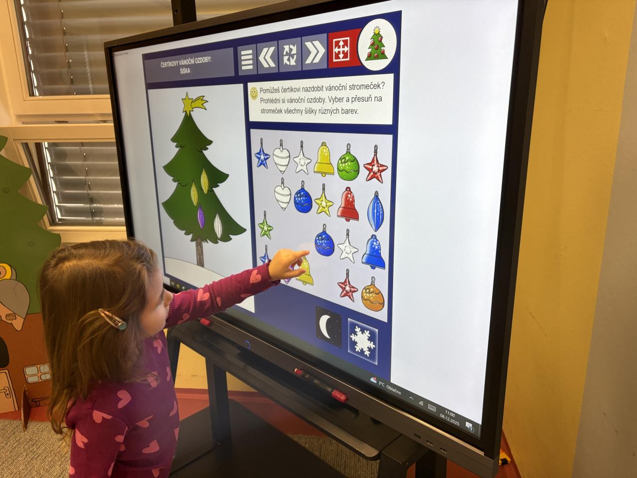 Procvičovali jsme spolupráci s kamarády při zdobení stromečku v prostoru třídy a na interaktivní tabuli jsme třídili baňky podle barev, tvarů a velikostí.